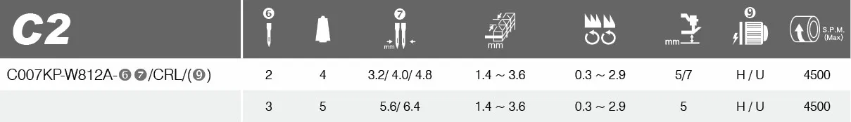 CE (Flattening): 3-thread stitch with overlock guide accessory included.