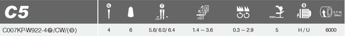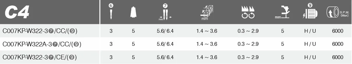 CC (Fold-down): 4-thread stitch (W322A model with dual-purpose needle plate/feed dog).